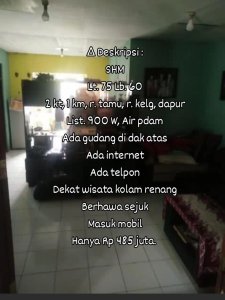 ∆ Deskripsi : SHM Lt. 75 Lb. 60 2 kt, 1 km, r. tamu, r. kelg, dapur List. 1300 W, Air pamdes Ada gudang di dak atas Ada internet Ada telpon Dekat wisata kolam renang Berhawa sejuk Masuk mobil Hanya Rp 485 juta nego.